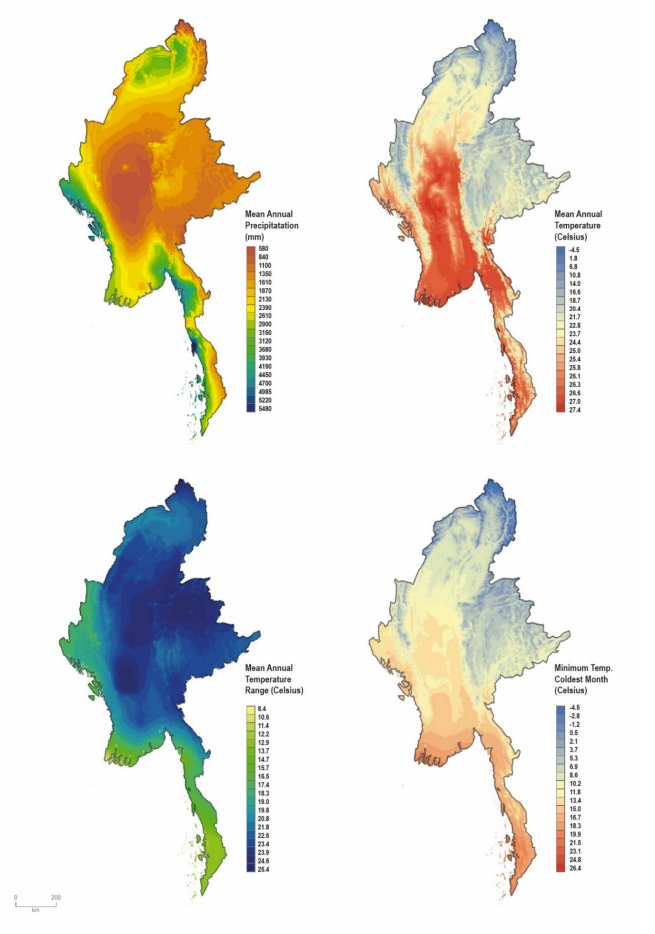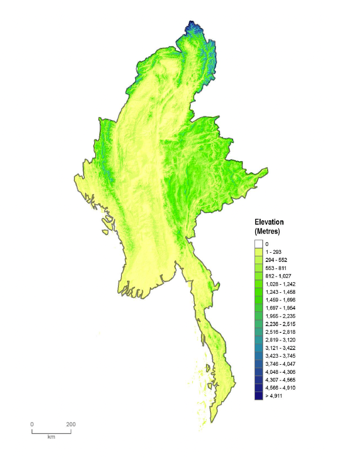 Myanmar (Figure 1.1) has a monsoonal climate throughout its full latitudinal range (9-28°N). The rain-bearing winds come from the south-west across the Bay of Bengal, with the wettest parts of the country being the Tanintharyi coast in the south and the Rakhine Bengal coast in the north receiving in excess of 5,000 mm of rainfall annually (Figure 1.2). The peak rainy season lasts from June to September, with rainfall persisting into October and November. December, January and February constitute the dry ‘cool’ season. Precipitation averages close to zero for the months December-March and, although temperatures are marginally cooler than in the rainy season, much of the country experiences significant rates of evapotranspiration and water deficits, especially in warmer months April and May at the end of the dry season prior to arrival of the monsoon.