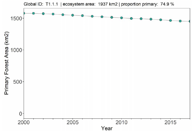 Ecosystem collapse definition: This ecosystem is regarded as collapsed when its area has declined to zero, when the proportion of the ecosystem considered primary forest declines to 0.